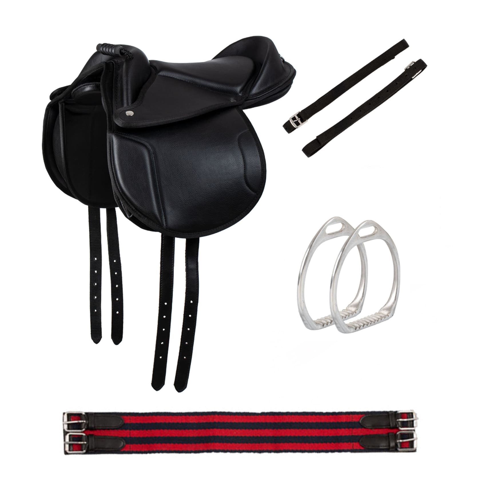 Sella inglese per pony shetland con maniglia, completa di staffe, staffe in cuoio e sottopancia.