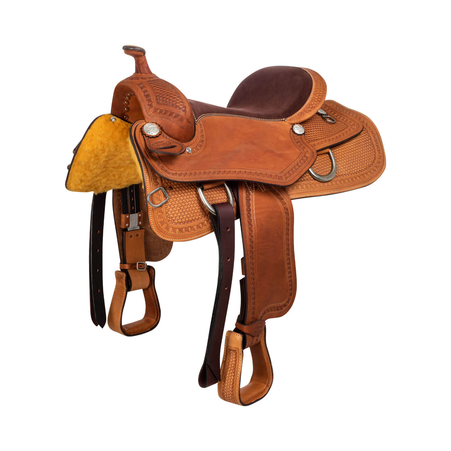 Sella western da reining realizzata in morbido cuoio con lavorazione vimini. Altamente performante e confortevole.