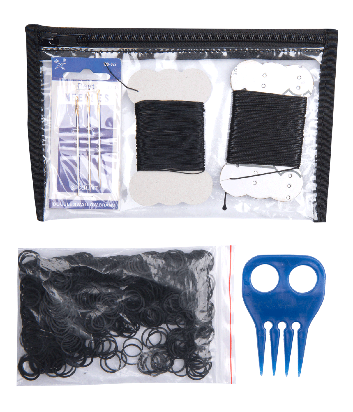 Set per intrecciare la criniera composto da elastici per criniera in gomma, un pettine, un set di aghi, un paio di forbici e un filato speciale per l'intrecciatura.