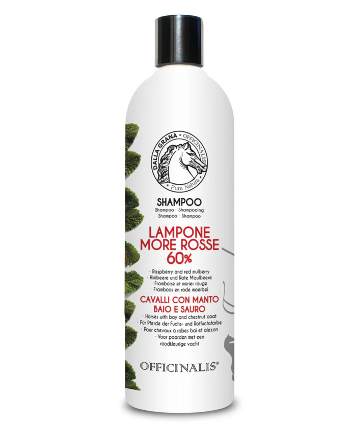 Shampoo a base di acqua officinale di more rosse e lampone che dona lucentezza e brillantezza al pelo e alla pelle del cavallo. I betacaroteni contenuti all'interno dello shampoo esaltano il colore sauro e baio del cavallo.