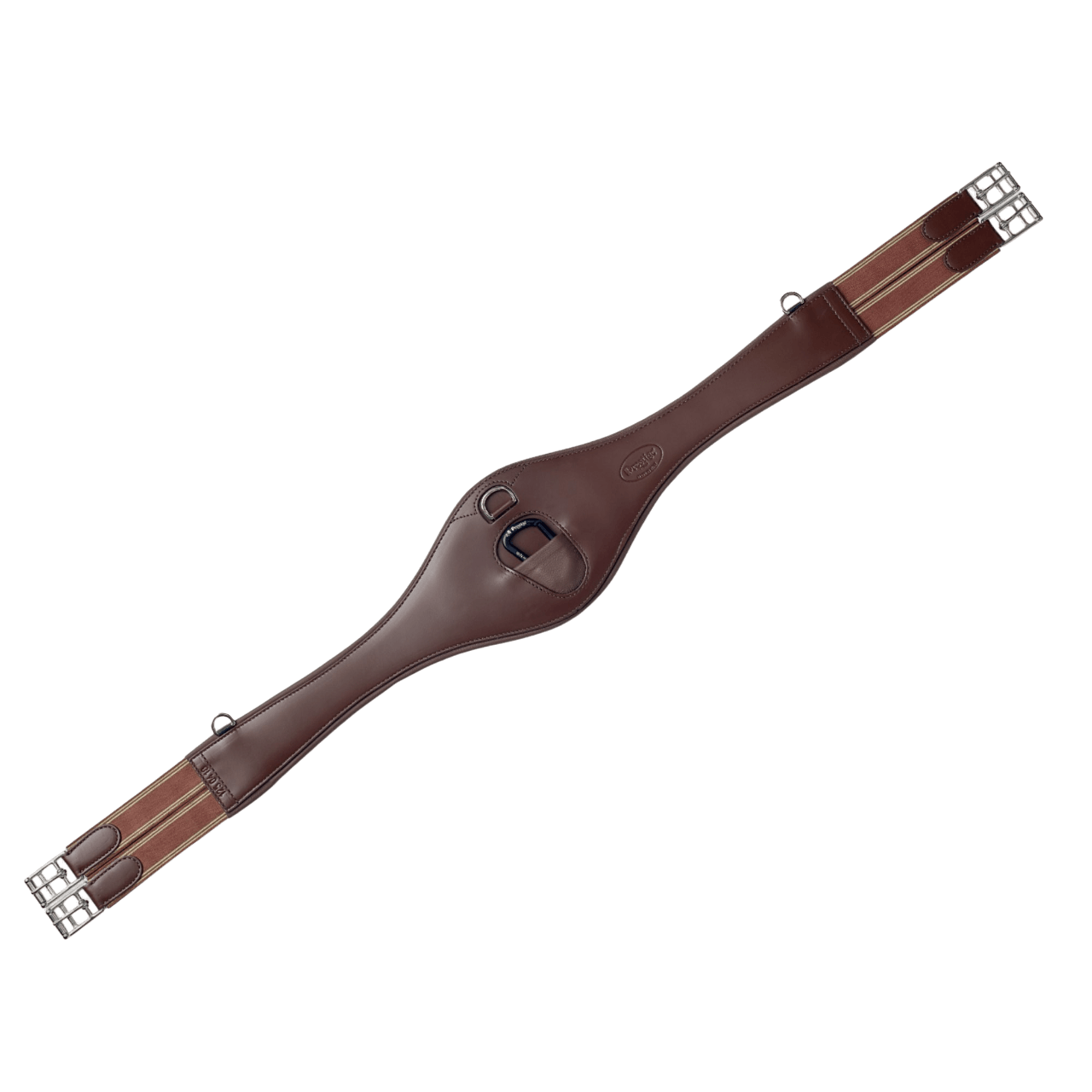 Sottopancia Prestige modello Special a caramella in cuoio liscio dotato di elastici su entrambi i lati, di anelli per le redini di ritorno e di un moschettone centrale per il pettorale.