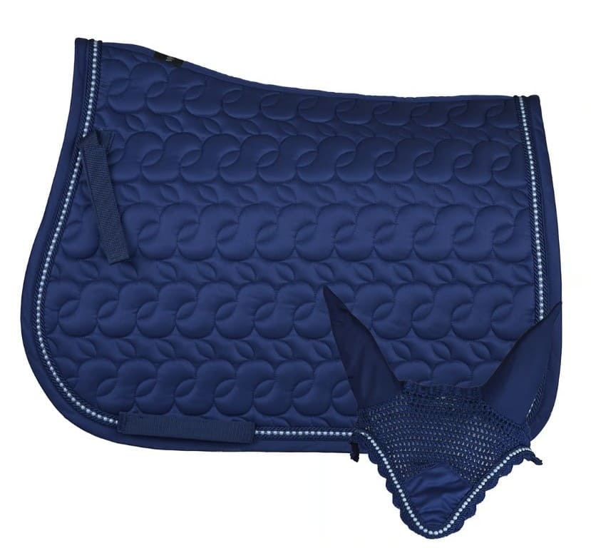 Completo composto da sottosella da salto in satein e dettagli perle, e cuffietta antimosche con orecchie elasticizzate di lycra.