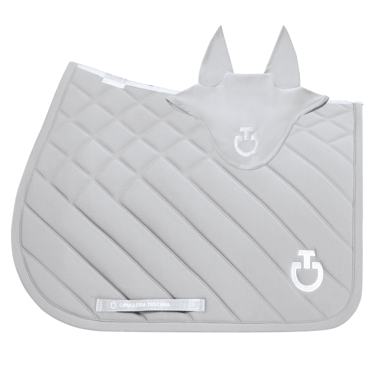 Set composto da sottosella da salto con esclusiva trapuntatura a diamante e linee e cuffietta abbinata.