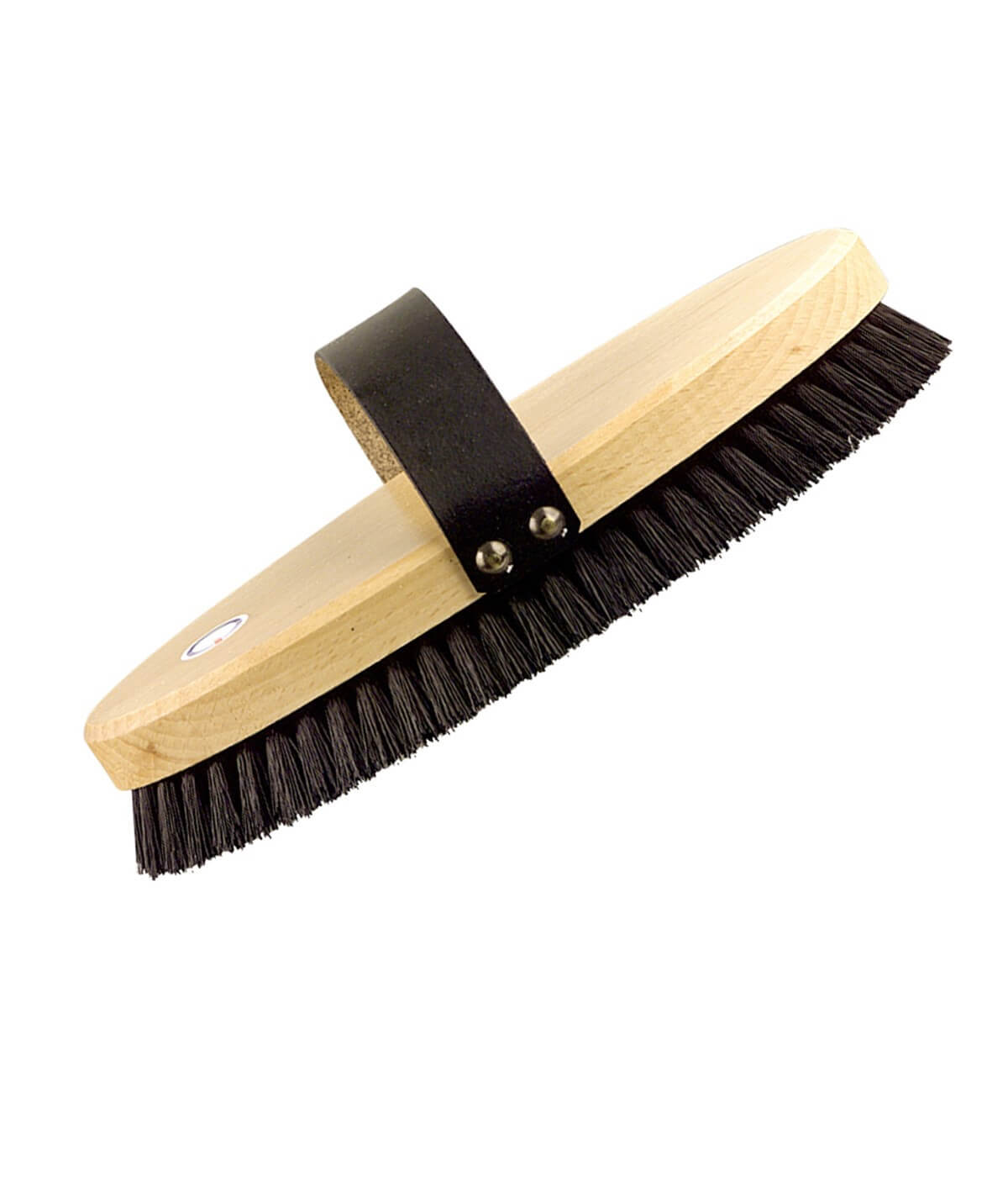 Spazzola con dorso in legno e passamano in cuoio. Setole esterne sintetiche e setole centrali in ottone.