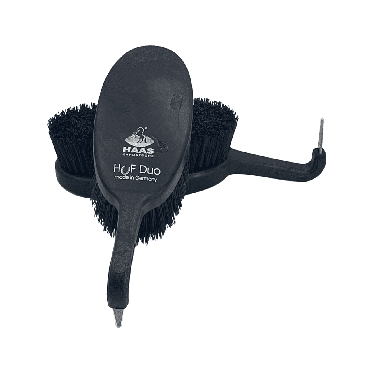 La spazzola HuF Duo combina un nettapiedi che garantisce un'efficace pulizia degli zoccoli e una spazzolina con setole di plastica più lunghe che puliscono efficacemente la parte superiore.