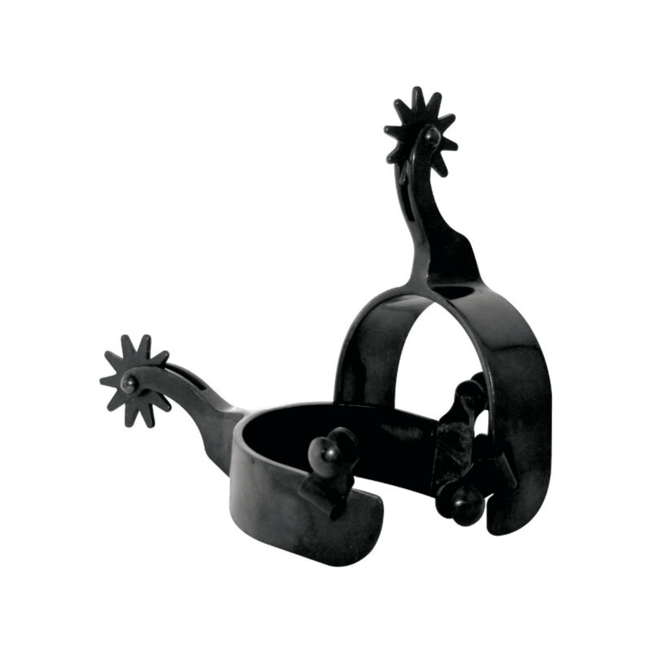 Speroni western a fascia larga neri in ferro brunito con gamba e rotella da 75 mm.