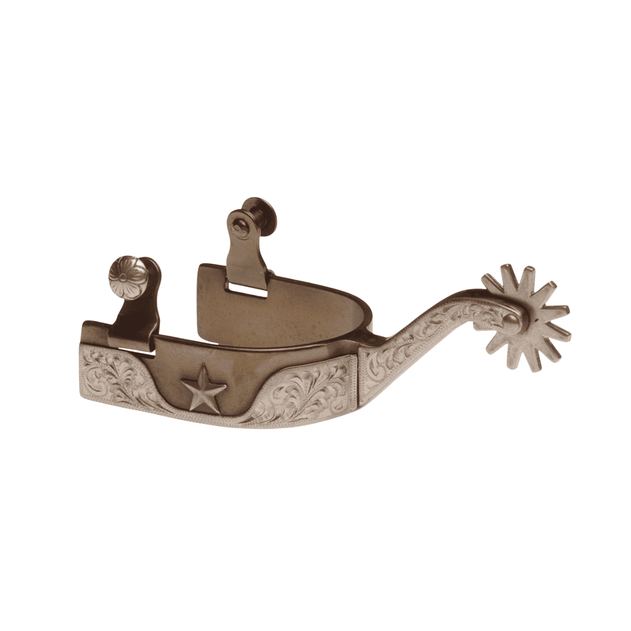 Speroni western in ferro brunito con decorazioni argentate e stella.