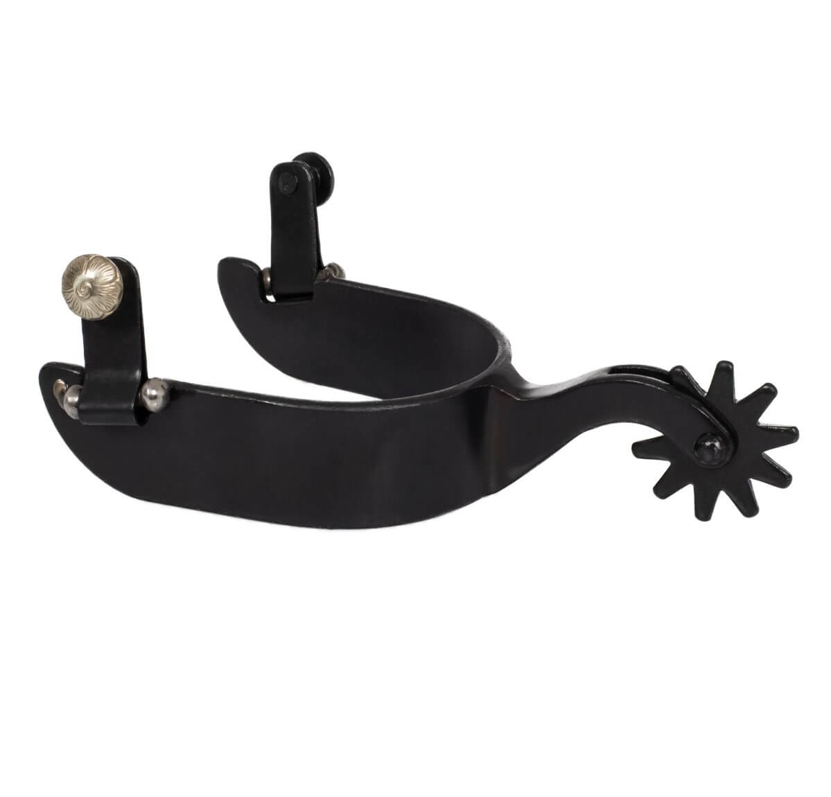 Speroni western interamente neri realizzati in ferro e dotati di una rotella posteriore dentata.