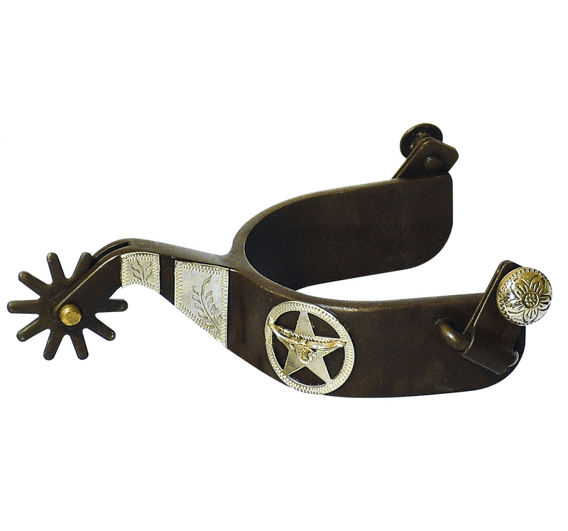 Speroni western in ferro brunito marrone riporti alpaca e stella argentati disponibili in taglia unica.