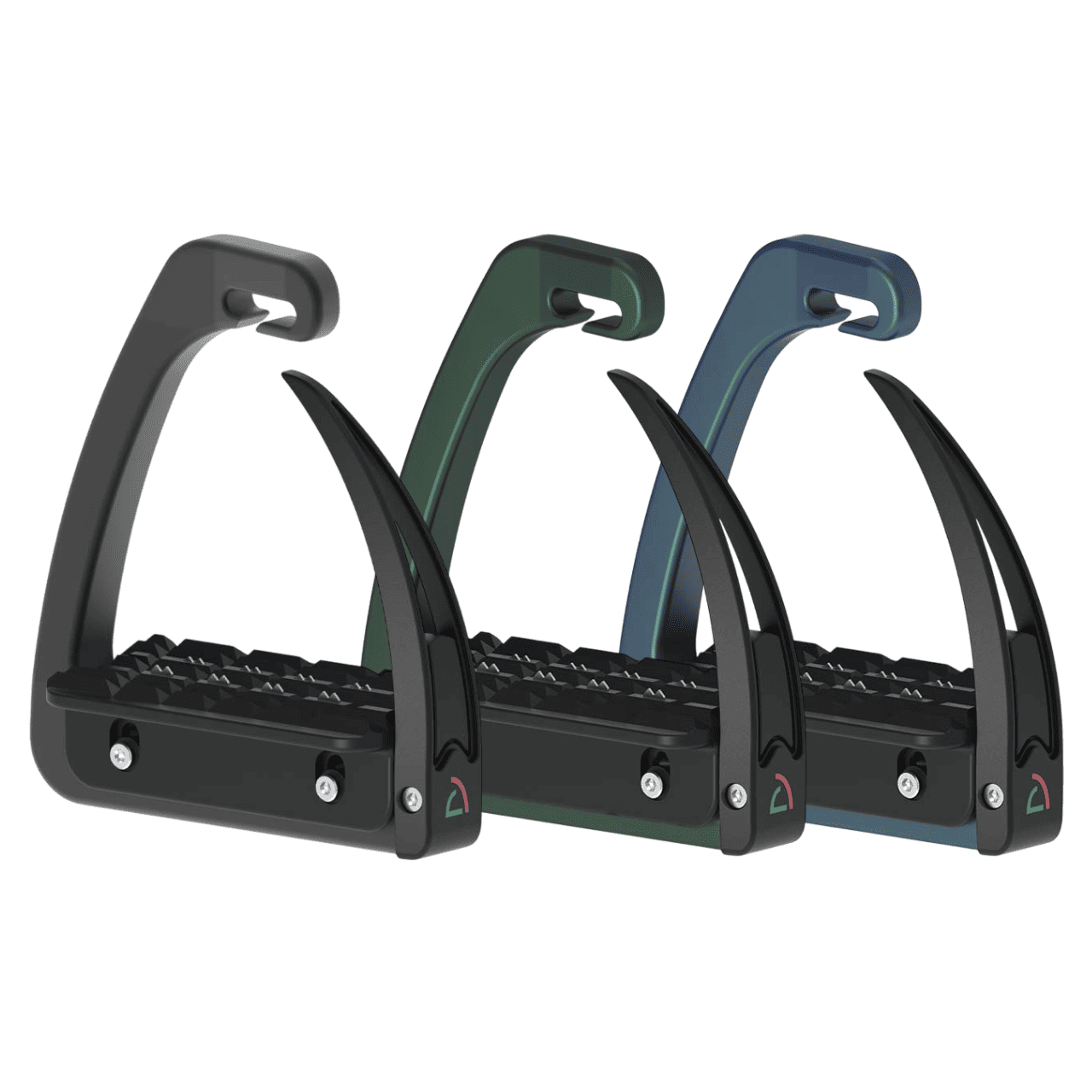 Staffe di sicurezza per equitazione modello S3 di Safe Riding con finitura Velvet super resistenti, con safety system per un rapido rilascio del piede e pedana ammortizzata inclinata. Prodotto 100% fatto in Italia.