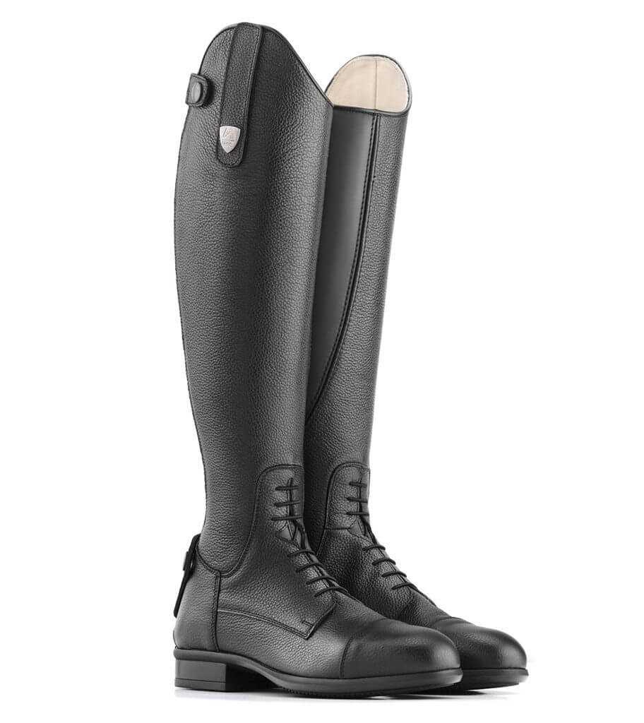 Stivali da equitazione in pelle bottalata di vitello con lacci anteriori e cerniera posteriore, suola in gomma e fascia elastica per una perfetta aderenza alla sella.