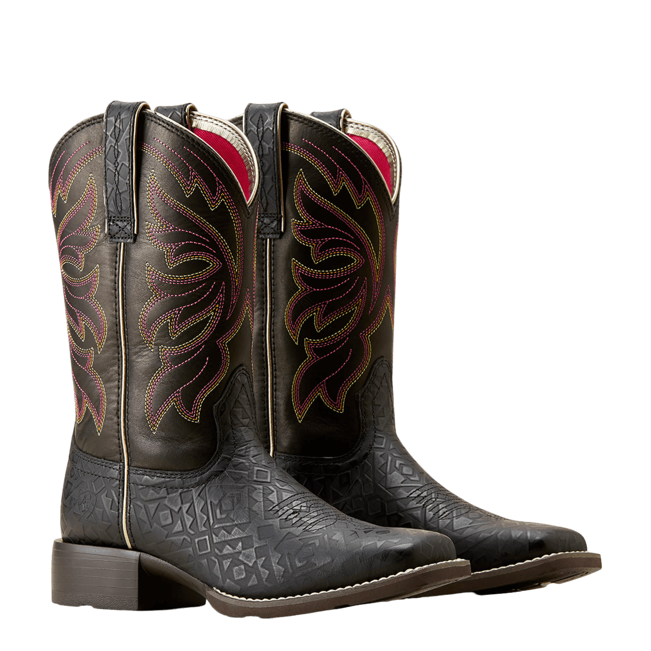 Stivali western da donna modello Buckley con suola in gomma, punta squadrata e pelle pieno fiore e pelle scamosciata.