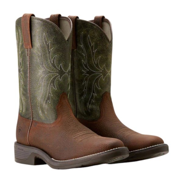 Gli stivali western da uomo di Ariat modello Ridgeback Round Toe combinano stile autentico e comfort grazie alla loro silhouette classica e ai materiali di alta qualità. Sono realizzati in pelle Toffee Brown con dettagli Moss Green, offrono resistenza e durata, ideali per affrontare ogni tipo di terreno.