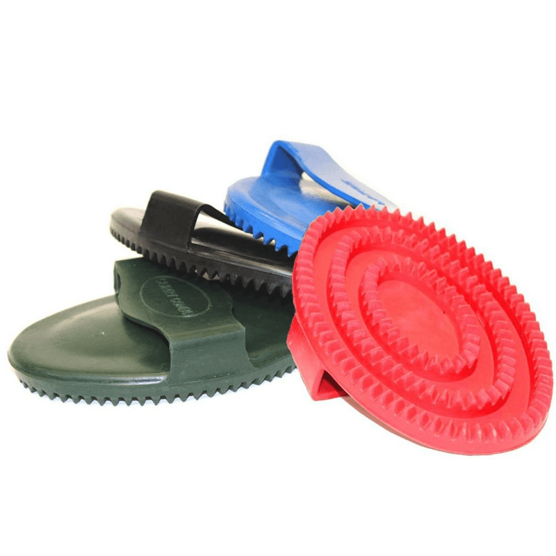 Striglia in gomma morbida disponibile nelle varianti di colore: blu, nero, rosso e verde.