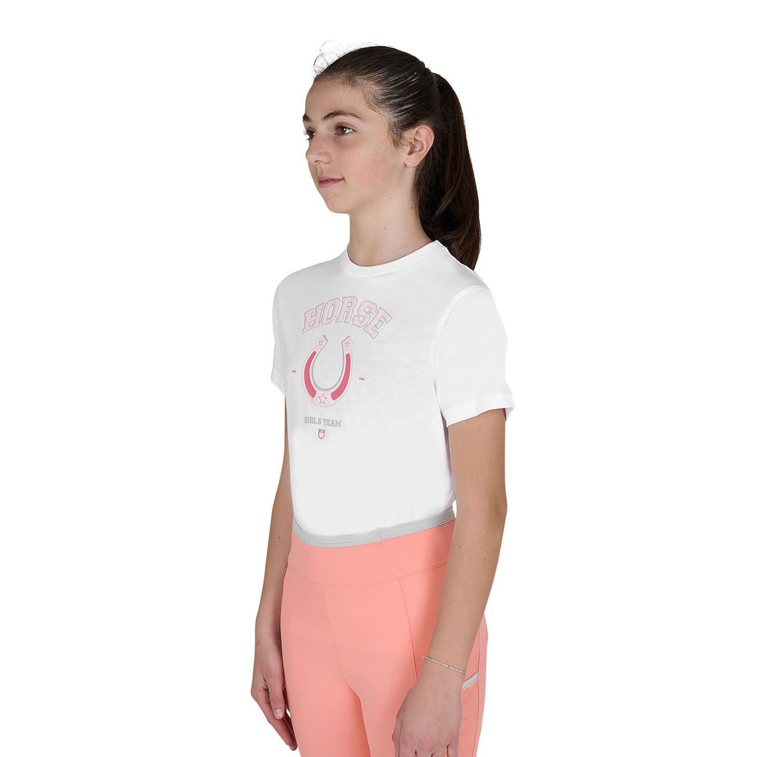 Dotata di girocollo a coste e maniche corte, si distingue per il suo design essenziale e alla moda. Le linee pulite sono arricchite da dettagli unici, come il logo Equestro, la scritta Horse Team oltre alla raffinata stampa sul petto raffigurante un ferro di cavallo sui toni del rosa.