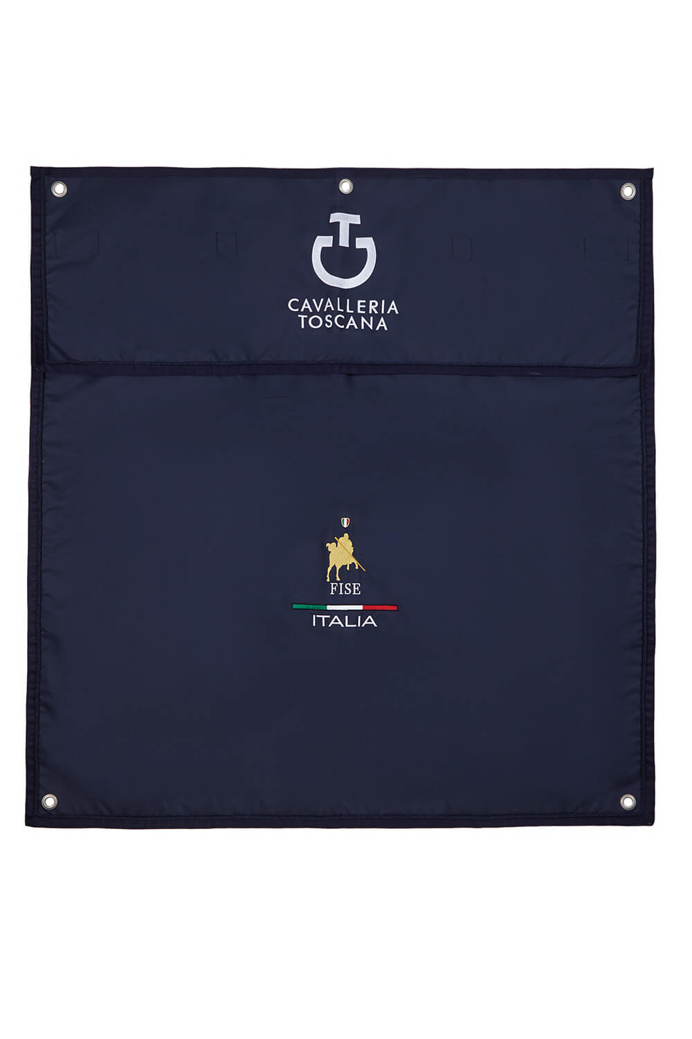 Tenda per box realizzata in tessuto impermeabile e resistente, è dotata di occhielli per il fissaggio ed è abbellita dai loghi Cavalleria Toscana e Fise.