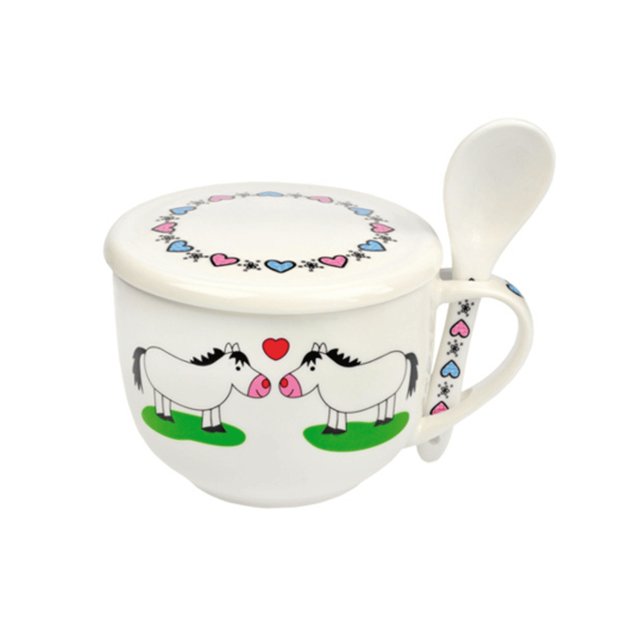 Tazza per latte o zuppa con cucchiaino che raffigura due cavalli che si guardano innamorati.