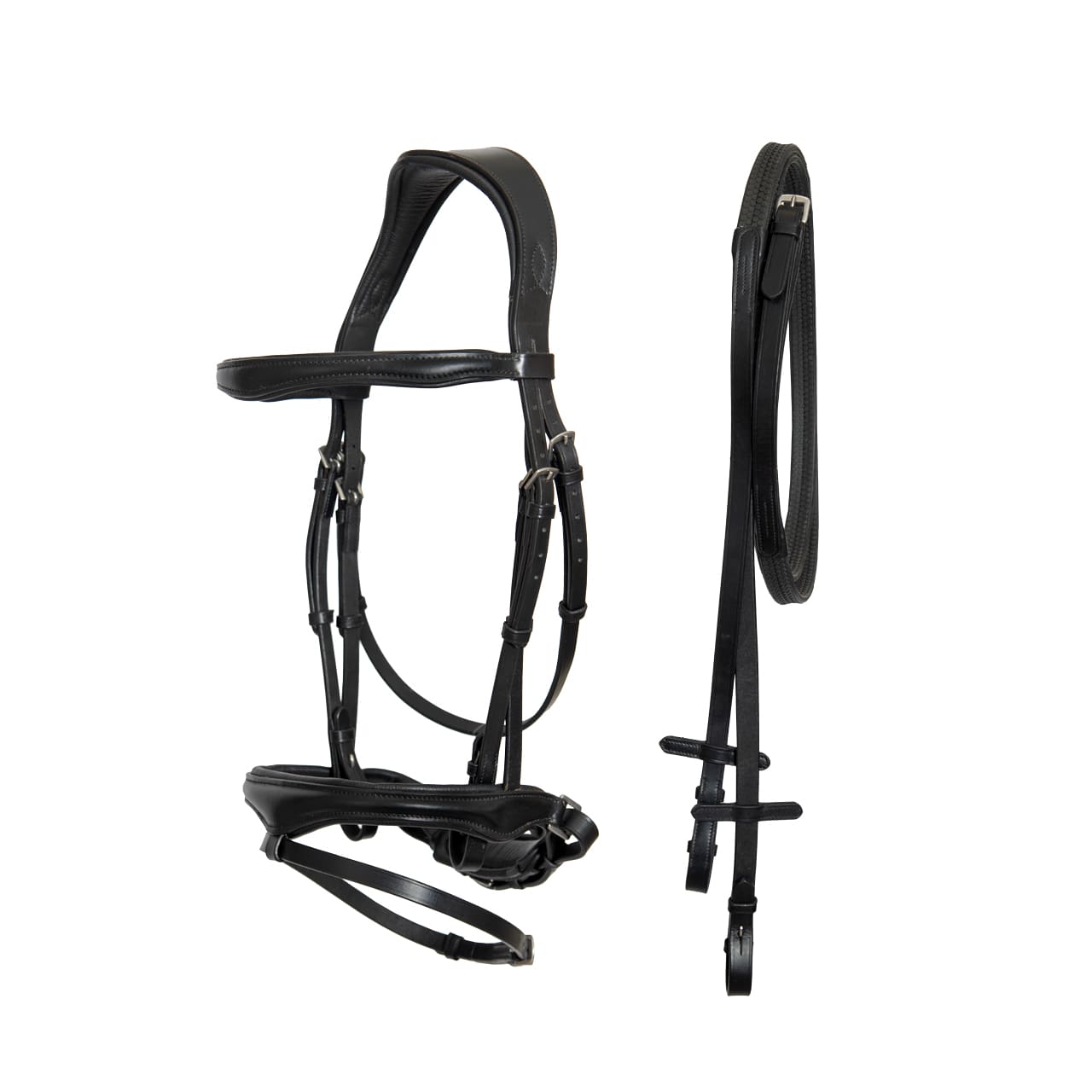 Testiera inglese in morbido cuoio italiano con sovracapo anatomico e fibbie in acciaio inox che garantiscono sicurezza, stabilità e resistenza nel tempo. Completa di redini in gomma.