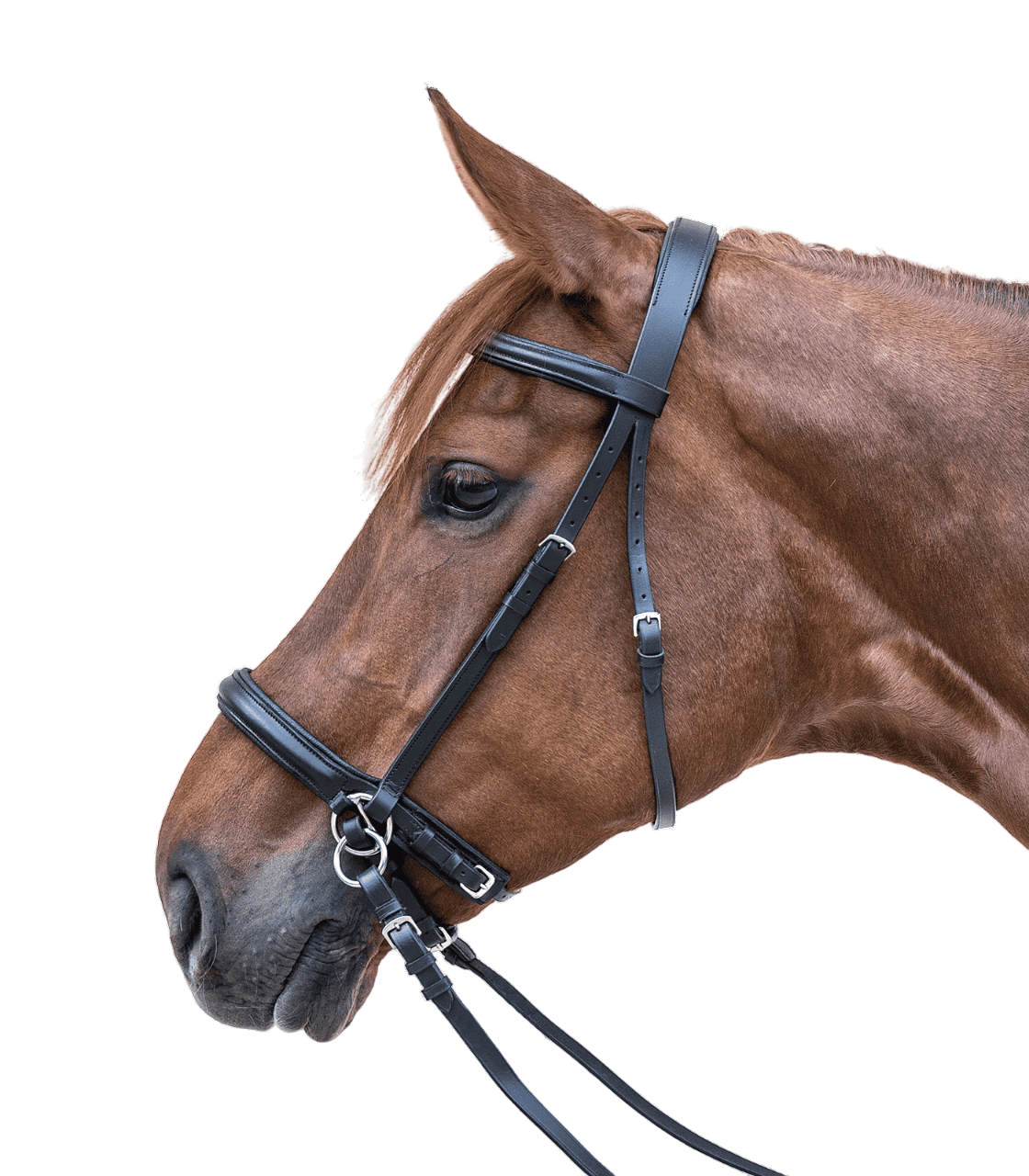Briglia senza imboccatura basata sull'azione sul mento modello Star di Waldhausen. La bitless è in cuoio con frontalino e sovracapo imbottiti.
