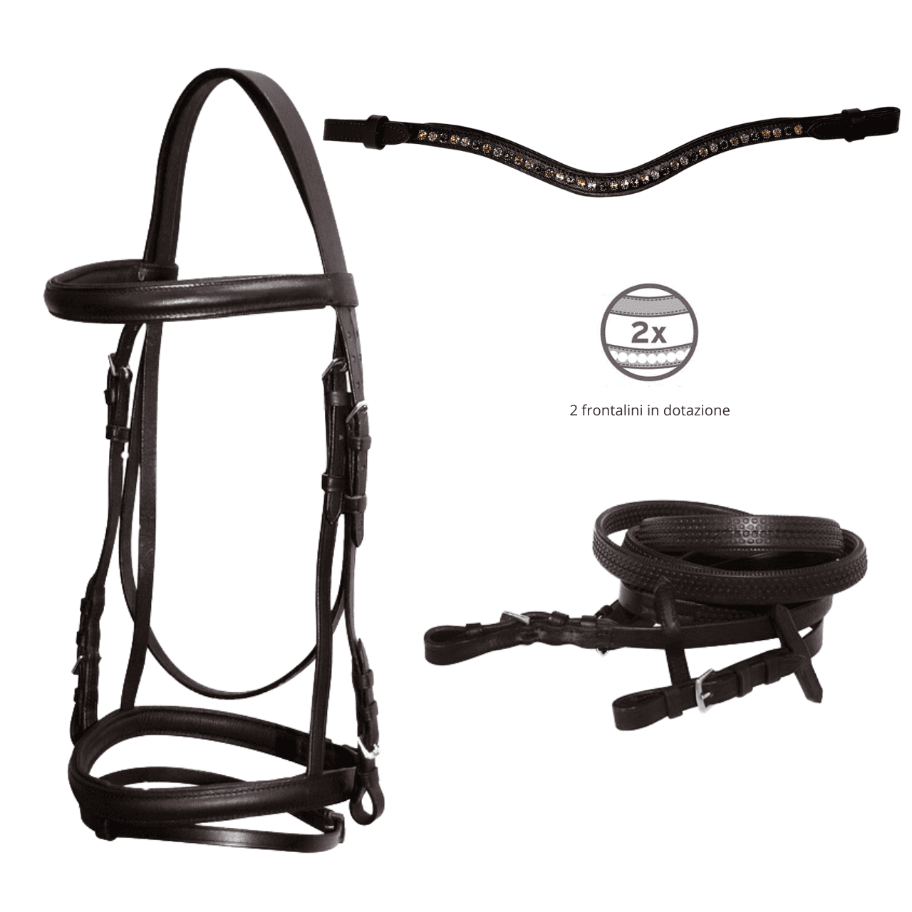 Testiera in cuoio marrone completa di redini in gomma e secondo frontalino con pietre tende sui toni del marrone e dell'ambra.