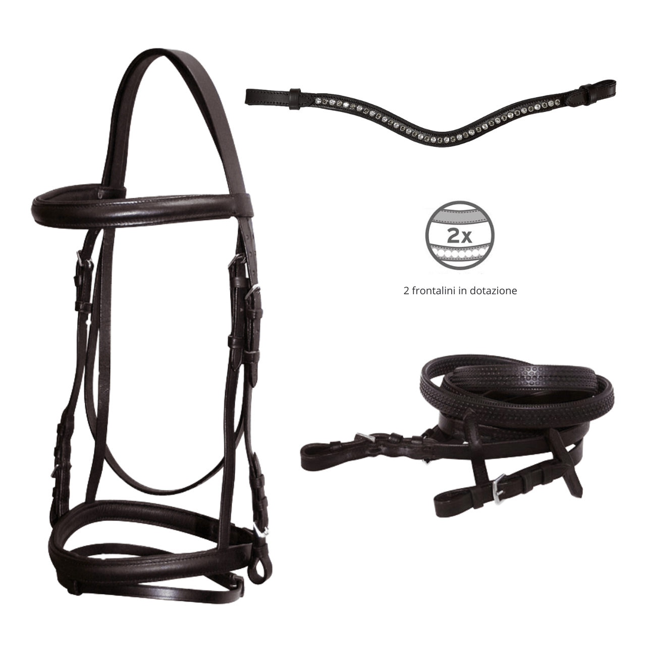 Testiera in cuoio marrone compresa di redini in gomma e frontalino 'Easy on' con il velcro per facilitare il cambio.