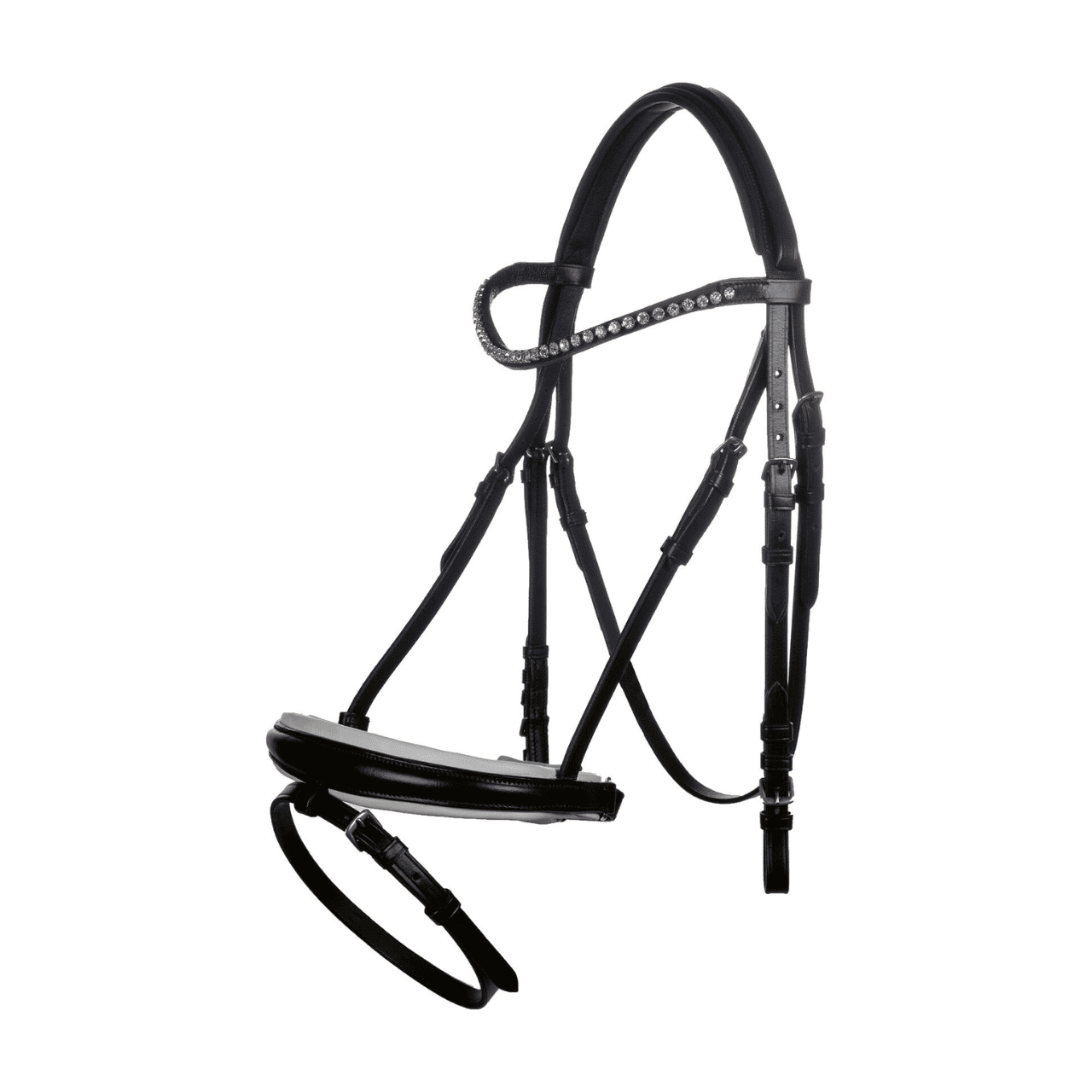 Briglia da dressage realizzata in pelle di qualità con frontalino decorato di strass e redini con fermi in pelle.