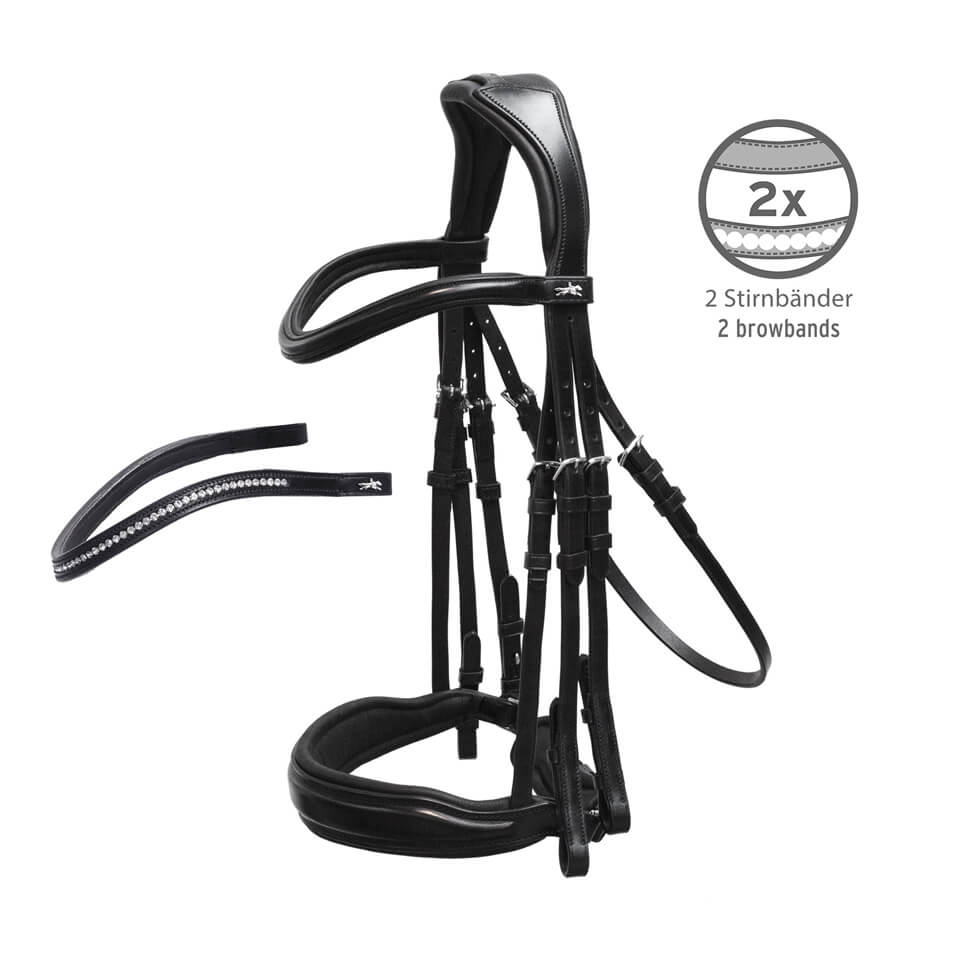 Questo modello è stato specificatamente adattato all'anatomia del cavallo e consente il movimento illimitato delle orecchie. Grazie alla riduzione della pressione nelle zone sensibili intorno agli zigomi e al collo, il comfort del cavallo aumenta notevolmente.