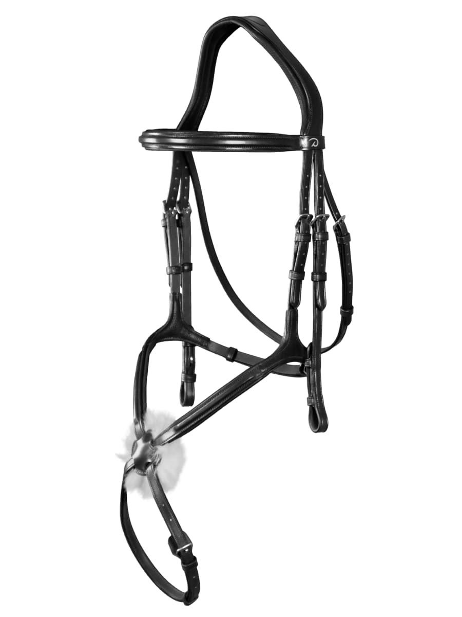 La testiera presenta un frontalino extra morbido e la capezzina a forma di 8 rialzata quadrata con anelli.