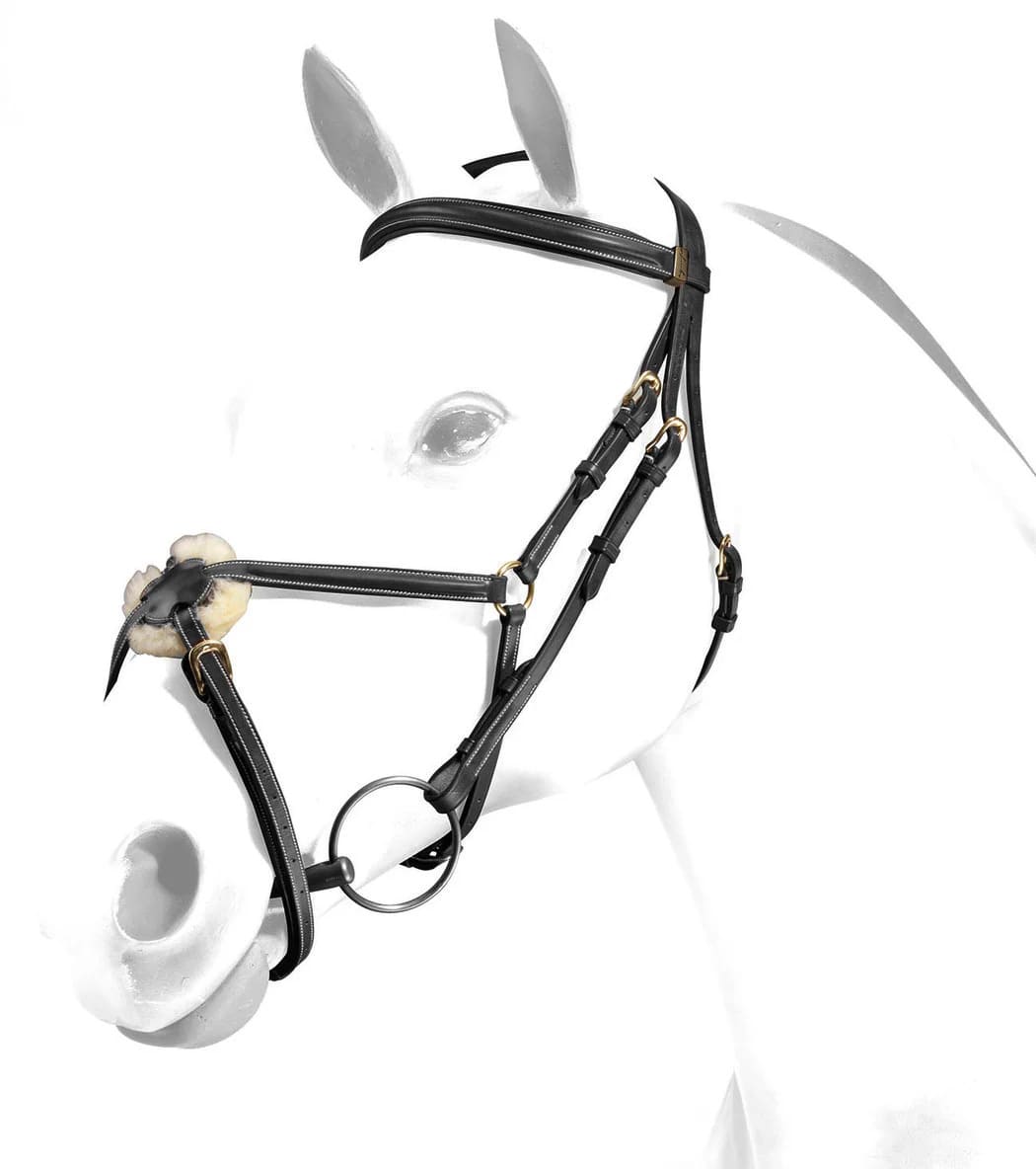 Testiera da salto in cuoio naturale, dotata di frontalino bombato e capezzina messicana. Disponibile con fibbie/finiture in ottone e acciaio, nei colori nero e marrone. Taglia cob, full Linea Emporio.