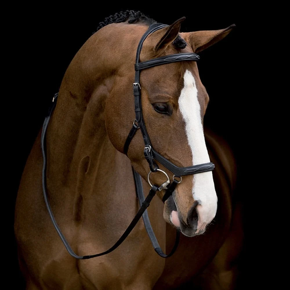 La testiera Micklem Competition è una testiera di alta qualità da competizione, realizzata in cuoio rifinito a mano con soffici imbottiture sul sovracapo, sul frontalino, sulla nasalina e sui montanti.