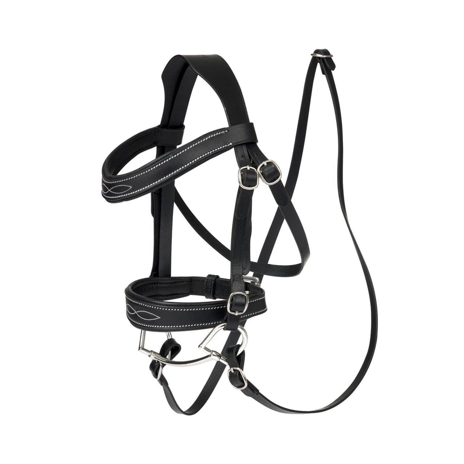 Testiera per hobby horse dotata di un frontalino imbottito in pelle nera dalla forma elegante e di una fascia nasale con cuciture decorative.