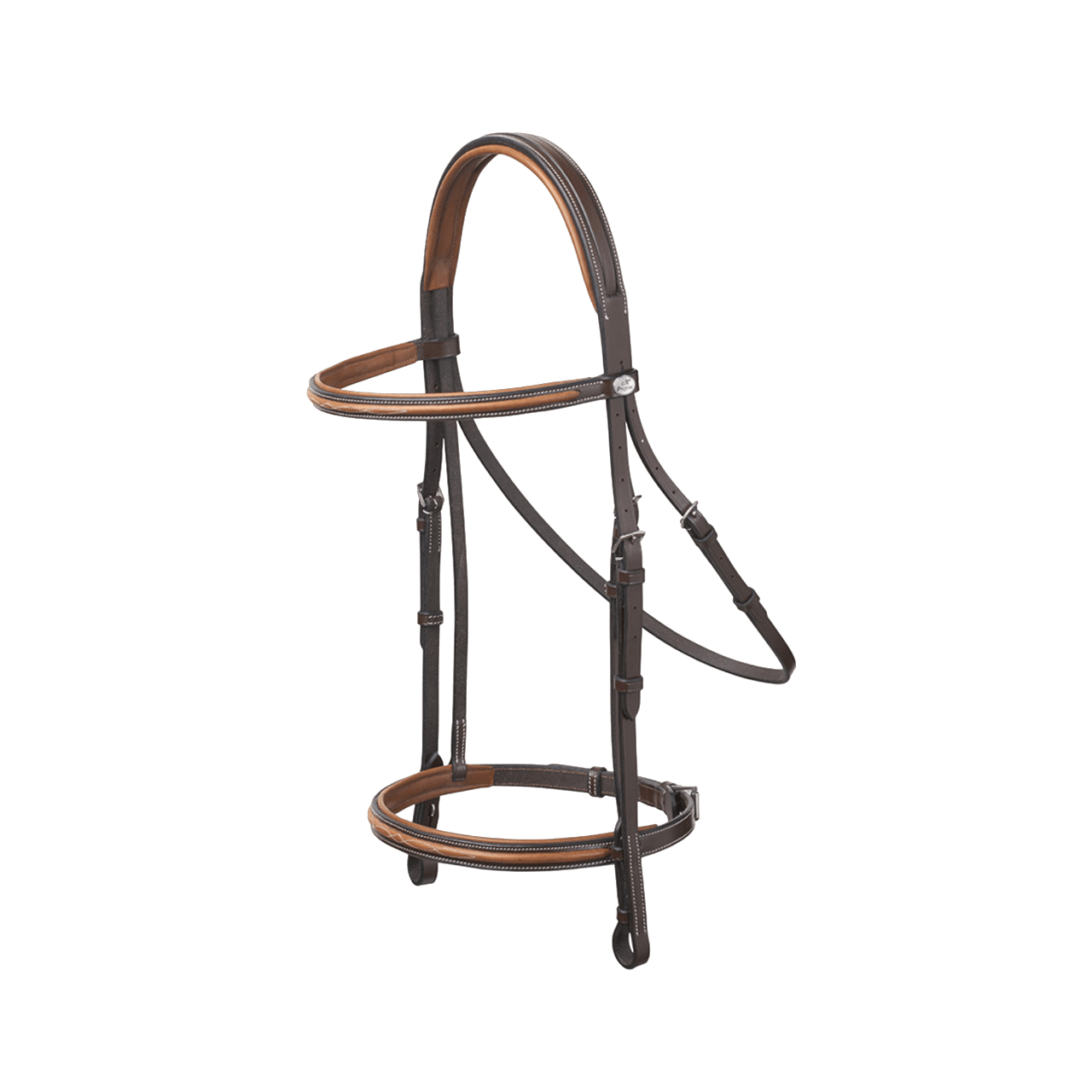 La testiera è finemente decorata con cuciture a contrasto, il frontalino e la capezzina hanno degli eleganti inserti in pelle.