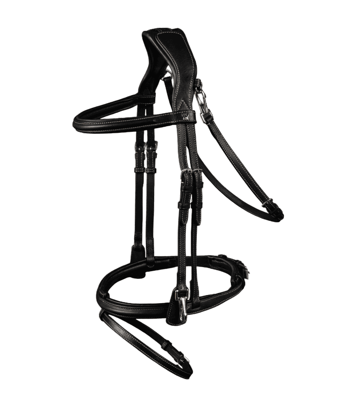Testiera inglese anatomica di Waldhausen appartenente alla collezione X-Line con moschettoni e fibbie in acciaio inox. Completa di redini.