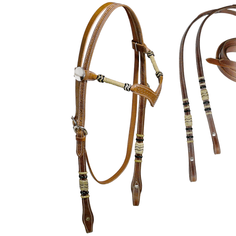 Testiera western con frontalino a v basket rawhide con redini disponibile in misura unica nelle barianti di colore rossiccio e marrone.