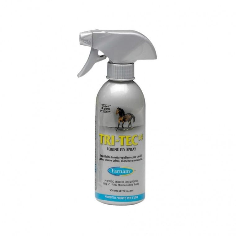 MODALITA’ D’USO:Agitare bene prima dell’uso. Prima di applicare il prodotto spazzolare il mantello contropelo per eliminare sporco e polvere. Spruzzare omogeneamente il Tri-Tec 14 su tutto il corpo. Dopo una prima applicazione, ripetere il trattamento dopo 7 giorni. Successivamente, applicare il prodotto ogni 14 giorni o dopo ogni volta che l’animale viene lavato.osi ectoparassiti la cui eliminazione risulta essere molto difficoltosa; questo soprattutto durante la stagione calda quando le infestazioni massive arrecano notevole disturbo agli animali. Per proteggerli è necessario trattare sia l’ambiente che l’animale con prodotti efficaci e a bassa tossicità. Tri-Tec 14 è uno speciale insettorepellente per cavalli che respinge mosche, tafani, e altri ectoparassiti fino a 14 giorni dall’applicazione. L’attività di Tri-Tec 14 è garantita dalla composizione che unisce l’azione immediata delle piretrine naturali (estratte dai fiori di Chrysanthemum cinerariaefolium), a quella più protratta nel tempo dei piretroidi.