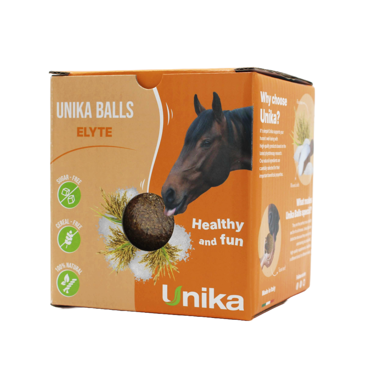 Unika Balls Elyte è ideata per apportare sali minerali nella dieta del cavallo, la cui introduzione è necessaria durante tutto il corso dell’anno per rifornire le quote che il cavallo perde con la sudorazione. Si presenta come una sfera provvista di una corda di fibre naturali grazie alla quale può essere appesa al box o nel trailer e che il cavallo può gustare durante l’arco della giornata.