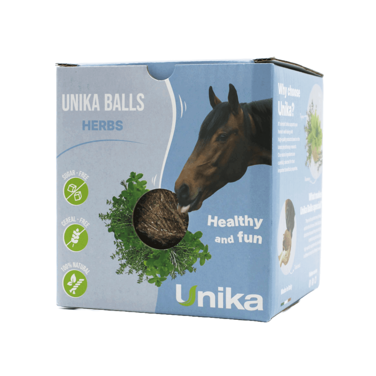 Unika Balls Herbs è formulata con un mix di erbe balsamiche come timo, rosmarino e menta. Si presenta come una sfera provvista di una corda di fibre naturali grazie alla quale può essere appesa al box o nel trailer e che il cavallo può gustare durante l’arco della giornata.