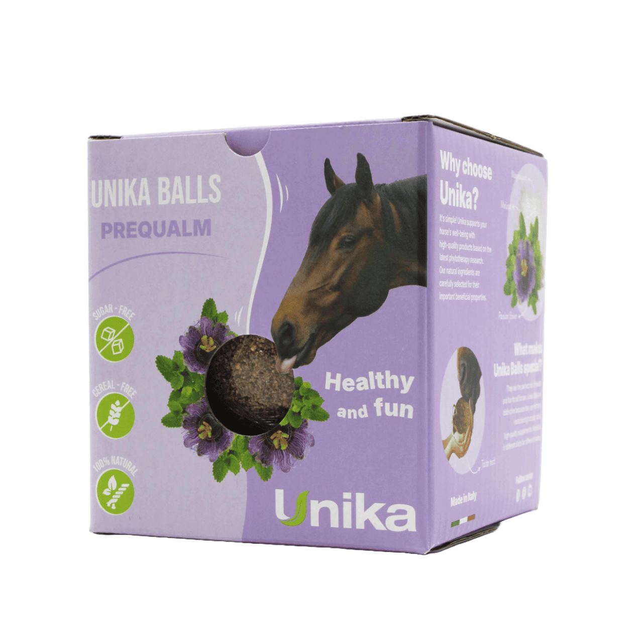 Unika Balls Prequalm è una palla senza cereali per cavalli formulata con magnesio, passiflora e melissa. Si presenta come una sfera provvista di una corda di fibre naturali grazie alla quale può essere appesa al box o nel trailer e che il cavallo può gustare durante l’arco della giornata.