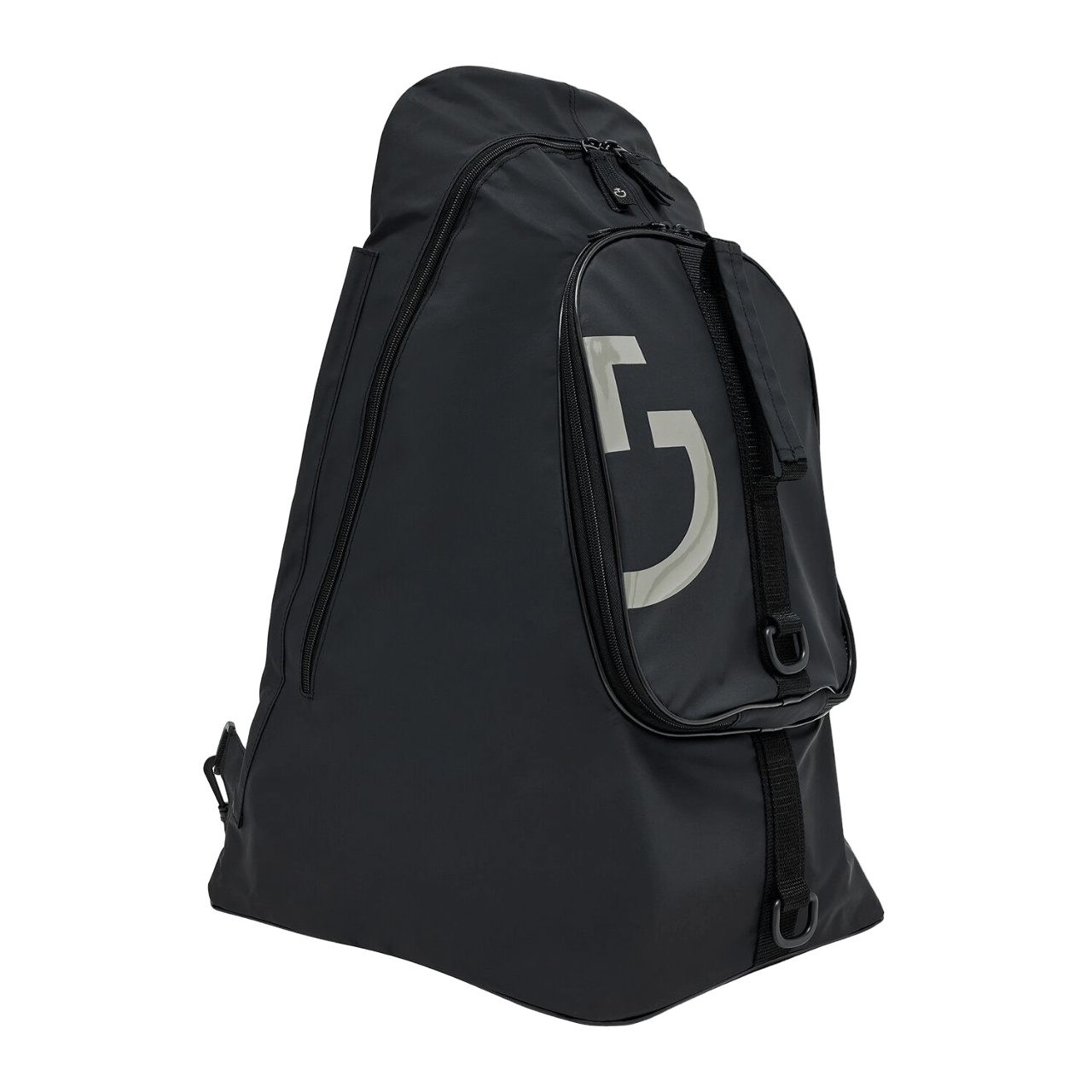 Presenta pratici scompartimenti per i diversi accessori, un aggancio sulla tasca frontale per il casco e lacci laterali per il frustino. L'ampia tasca interna comprende uno scompartimento per il portatile.