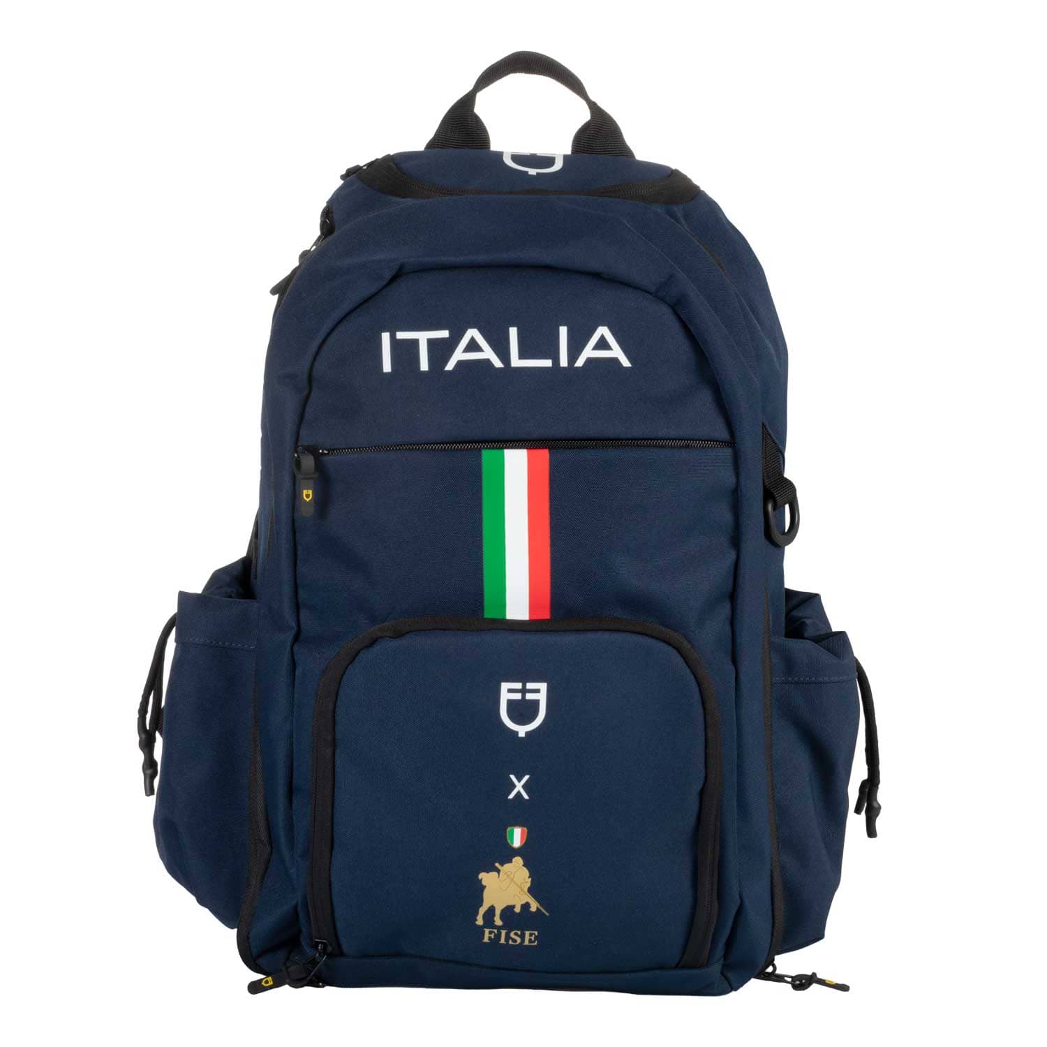 Scritta Equestro Italia bianca stampata in 3D sul fianco destro e sinistro, scritta Italia tricolore stampata in 3D sulla parte superiore dello zaino e stampa 3D del logo Equestro X FISE sulla tasca frontale.